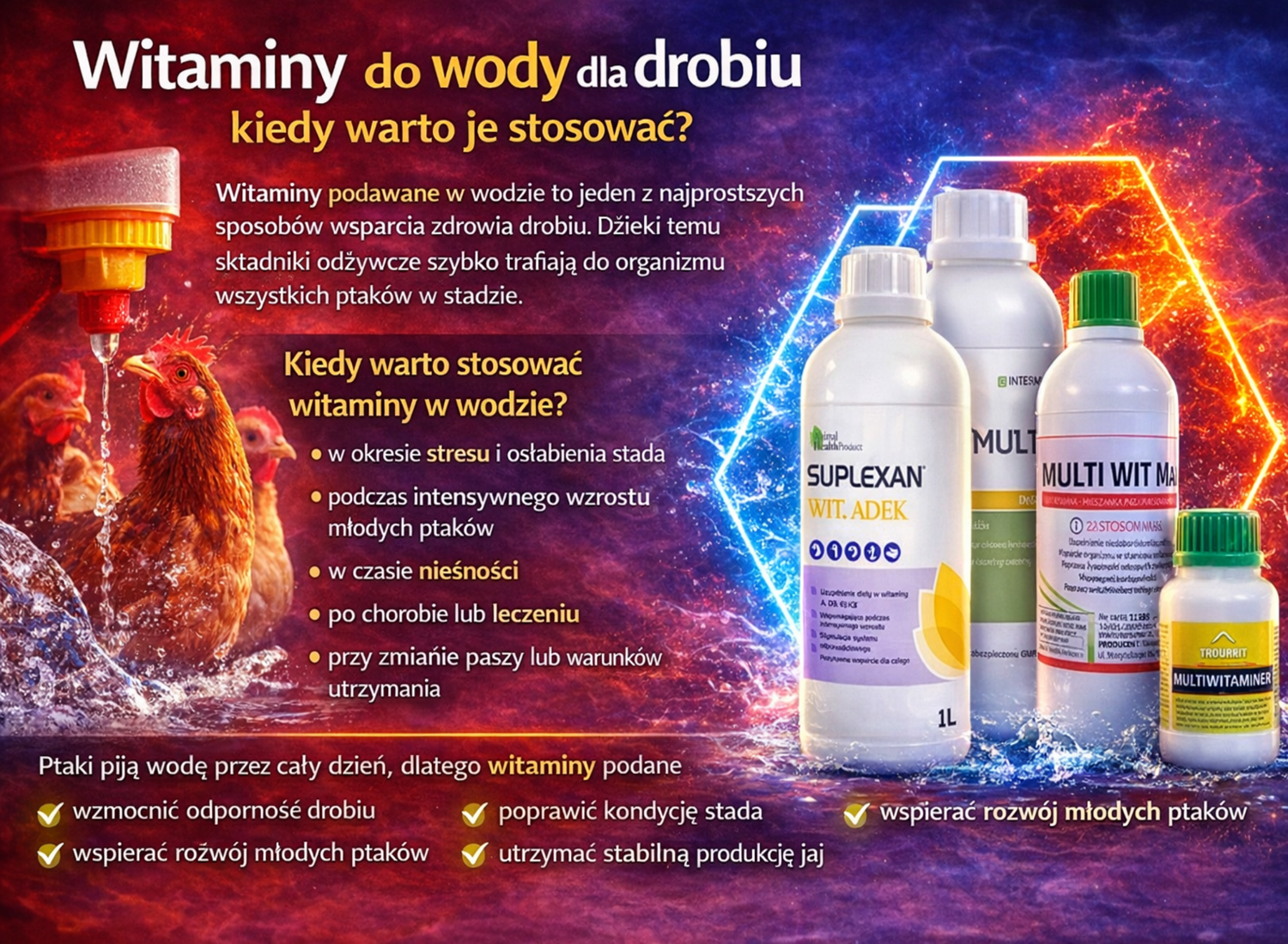 Prawidłowe żywienie drobiu to nie tylko dobrej jakości pasza, ale również odpowiednia suplementacja witamin i minerałów. Jednym z najprostszych sposobów wsparcia organizmu ptaków jest podawanie preparatów w wodzie pitnej. Dzięki temu składniki odżywcze są szybko przyswajane i trafiają do wszystkich ptaków w stadzie. Preparaty witaminowe szczególnie dobrze sprawdzają się w okresach stresu, intensywnego wzrostu, nieśności