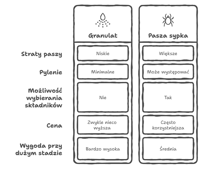 Nie ma jednej uniwersalnej odpowiedzi. Wybór między paszą sypką a granulatem powinien zależeć od: