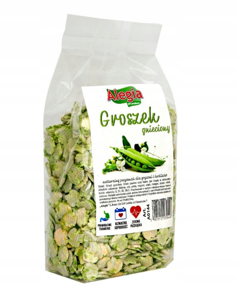 Groch gnieciony 300g Alegia to naturalny przysmak roślinny przeznaczony dla królików i gryzoni. Płatki grochu stanowią wartościowe uzupełnienie codziennej diety, dostarczając łatwo przyswajalnego białka roślinnego, węglowodanów oraz błonnika.
