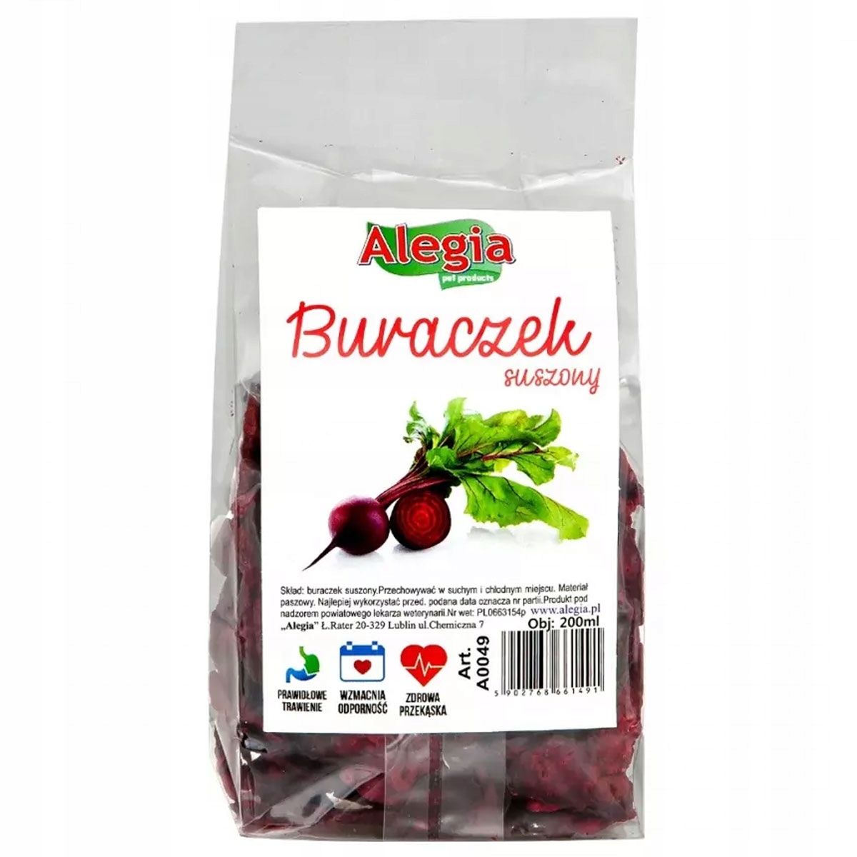 Czips z buraka 60g Alegia to w 100% naturalny przysmak dla królików i gryzoni. Suszone plasterki buraka są naturalnie słodkie, aromatyczne i chętnie zjadane przez małe zwierzęta. To zdrowe urozmaicenie codziennej diety, które dostarcza błonnika i wspiera prawidłowe funkcjonowanie układu pokarmowego.