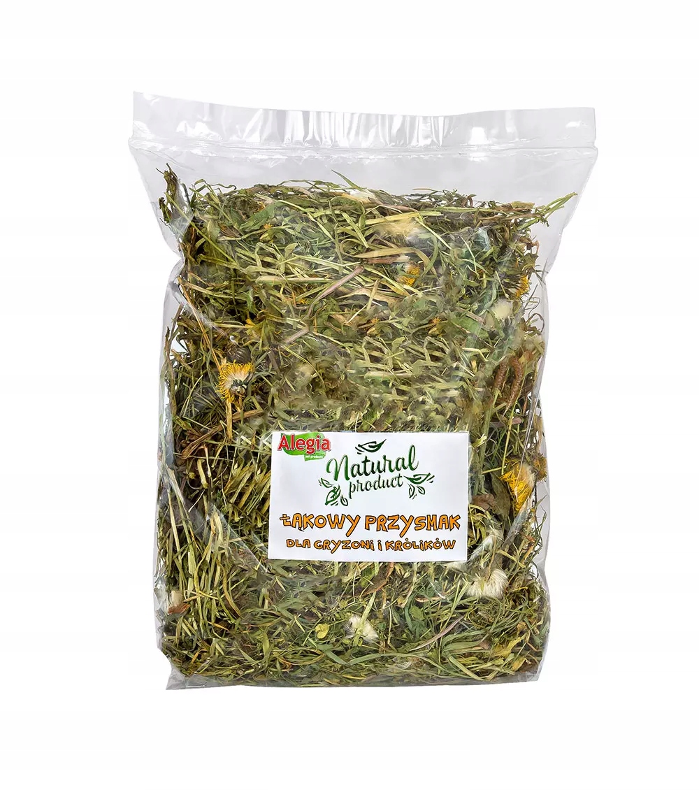 Przysmak łąkowy 150g Alegia to naturalna mieszanka traw i ziół przeznaczona dla królików i gryzoni. Bogata w włókno surowe kompozycja wspiera prawidłowe trawienie oraz pomaga w naturalnym ścieraniu stale rosnących zębów. To zdrowe urozmaicenie codziennej diety, które zwierzęta chętnie zjadają – pachnie świeżą łąką i zachęca do żucia.