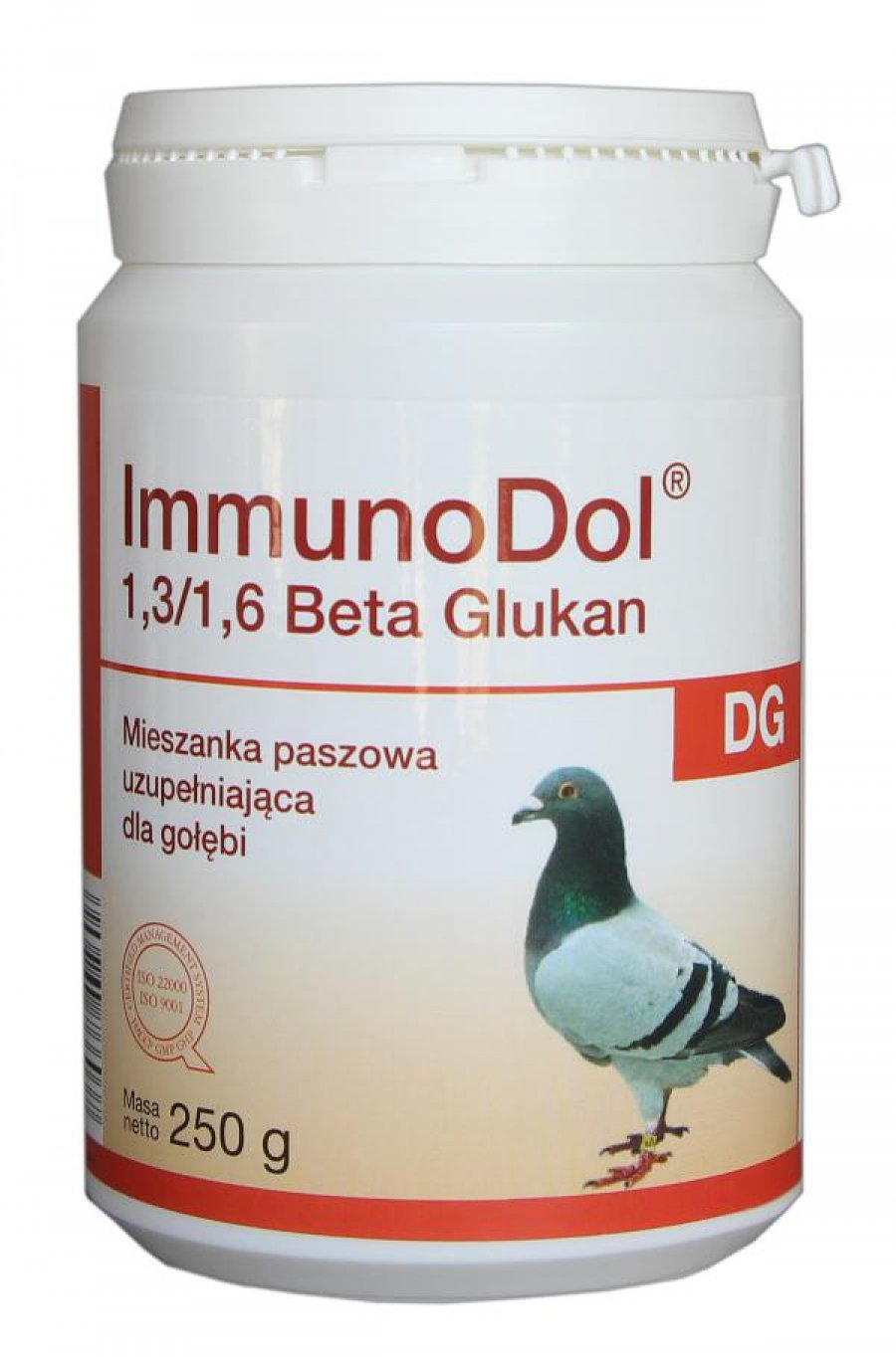 ImmunoDol DG to mieszanka paszowa uzupełniająca zawierająca Beta-1,3/1,6-glukan oraz drożdże piwne, przeznaczona do wzmacniania odporności gołębi. Preparat aktywuje naturalne mechanizmy obronne organizmu, stymulując komórki układu immunologicznego. Produkt został opracowany przez renomowanego producenta Dolfos.