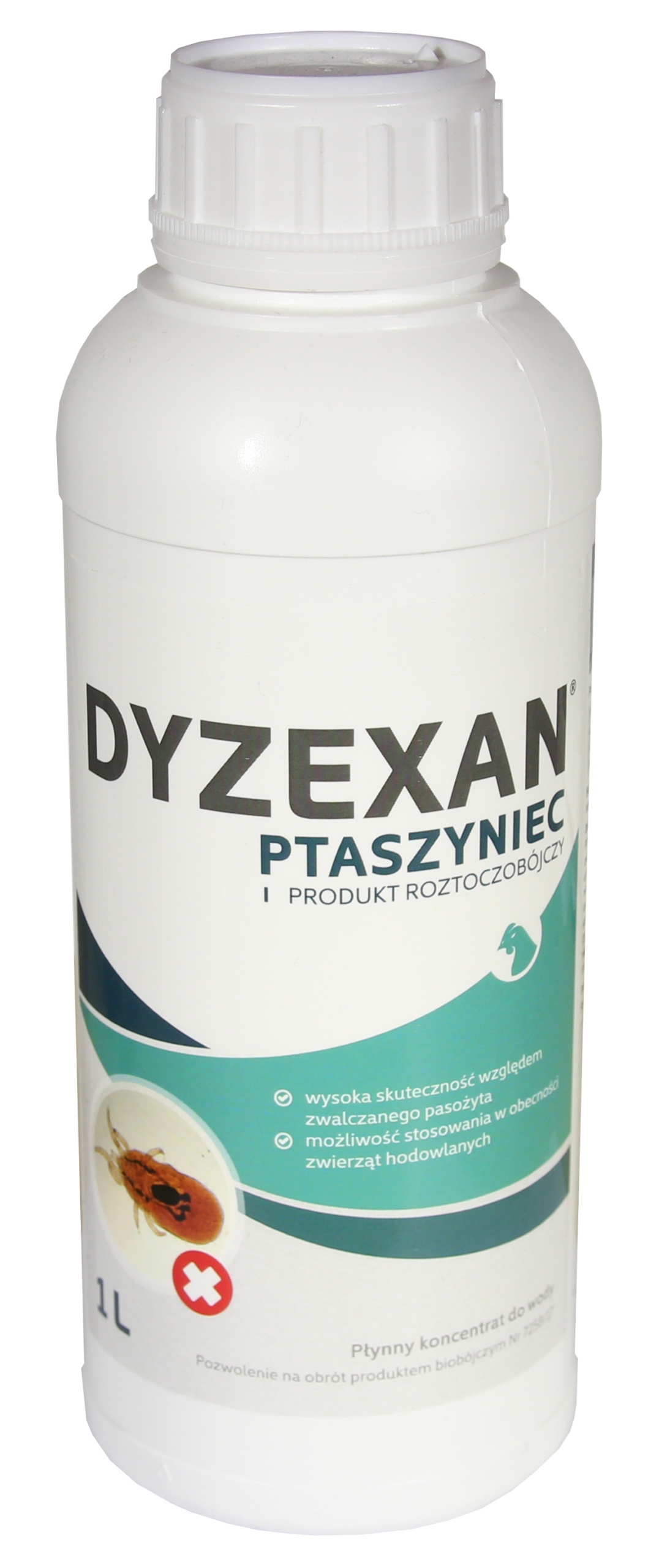 Dyzeaxan Ptaszyniec 1 l to profesjonalny preparat o działaniu fizycznym, przeznaczony do skutecznego zwalczania pasożytów bytujących na skórze i piórach ptaków oraz w ich otoczeniu, w szczególności ptaszyńca kurzego (Dermanyssus gallinae). Preparat marki Dyzeaxan działa mechanicznie – bez pestycydów i substancji toksycznych, dzięki czemu nie wymaga okresu karencji i może być stosowany w obecności ptaków, również w trakcie produkcji jaj oraz lotów gołębi.