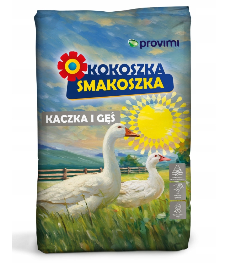 Pasza dla kaczek i gęsi 25 kg Kokoszka Smakoszka START to dobrze przemyślana mieszanka na sam początek odchowu. W pierwszych tygodniach życia ptaki rosną bardzo intensywnie, dlatego potrzebują stabilnego i łatwo przyswajalnego źródła składników odżywczych. Ta pasza została stworzona właśnie pod ten etap – od 1 do 28 dnia życia.