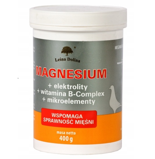 Leśna Dolina Magnesium 400 g to specjalistyczny preparat elektrolitowy w proszku, przeznaczony dla gołębi pocztowych i ozdobnych w okresach wzmożonego wysiłku fizycznego. Produkt zawiera magnez, elektrolity, witaminy z grupy B oraz mikroelementy, które wspierają prawidłową pracę mięśni, poprawiają wydolność lotową i przyspieszają regenerację organizmu po locie. Magnesium dla gołębi skutecznie zapobiega zakwaszeniu organizmu oraz ogranicza ryzyko skurczów mięśni podczas intensywnych lotów.