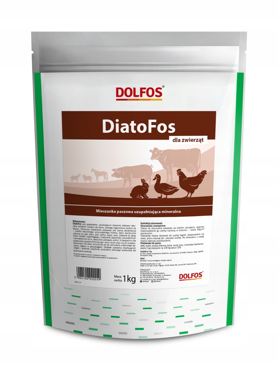 DiatoFos 1 kg to mineralna mieszanka paszowa uzupełniająca przeznaczona dla drobiu, bydła, trzody chlewnej, koni, owiec, kóz oraz zwierząt futerkowych. Preparat zawiera ziemię okrzemkową, będącą naturalnym źródłem przyswajalnego krzemu, który wspiera kondycję skóry, piór, sierści, kopyt i racic. Produkt został opracowany przez renomowanego producenta – Dolfos.