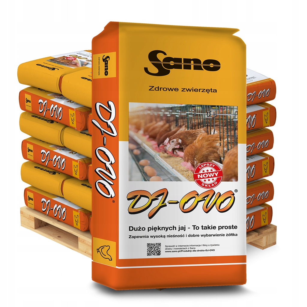 Sano DJ-Ovo sypka to wysokiej jakości pełnoporcjowa pasza dla kur niosek, opracowana przez firmę Sano z myślą o uzyskaniu maksymalnej wydajności nieśności, bardzo dobrej jakości jaj oraz utrzymaniu zdrowia i dobrej kondycji całego stada. Produkt przeznaczony jest do codziennego żywienia niosek w każdym systemie chowu – klatkowym, ściółkowym oraz wolnowybiegowym.