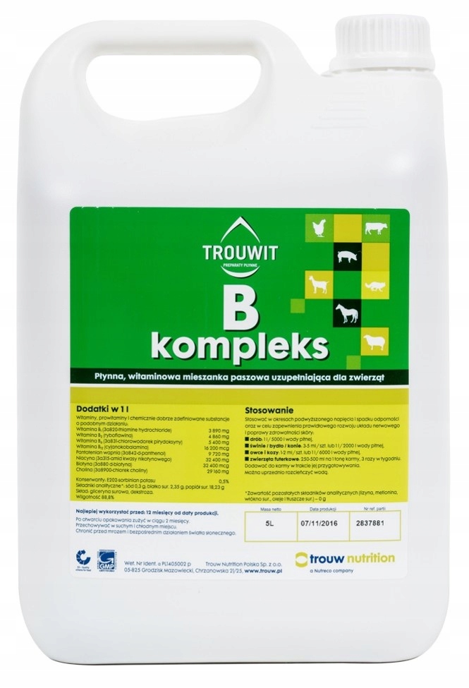 Trouwit B-kompleks 5 L to płynna mieszanka paszowa uzupełniająca, opracowana z myślą o wsparciu zwierząt gospodarskich w kluczowych momentach rozwoju. Preparat przeznaczony jest do stosowania u drobiu, bydła, trzody chlewnej, koni oraz innych zwierząt w okresach intensywnego wzrostu, obniżonej odporności, stresu i rekonwalescencji. Dostarcza komplet witamin z grupy B, które są niezbędne dla prawidłowego funkcjonowania układu nerwowego, pokarmowego i mięśniowego.