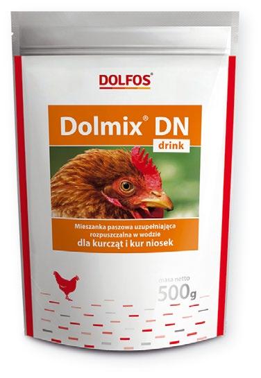 Dolmix DN drink 500 g to mieszanka paszowa uzupełniająca do rozpuszczania w wodzie pitnej, przeznaczona dla niosek reprodukcyjnych, niosek towarowych oraz kurcząt. Preparat został opracowany z myślą o okresach zwiększonego obciążenia organizmu ptaków – szczególnie podczas stresu, upałów oraz spadku pobrania paszy. Produkt pochodzi od renomowanego producenta Dolfos.