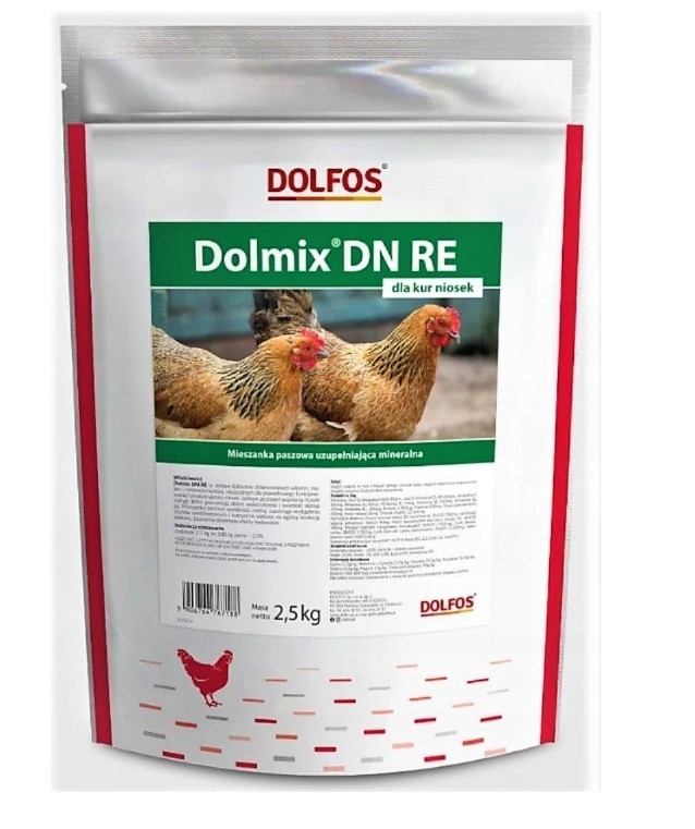 Dolmix DN RE 2,5 kg to mineralno-witaminowa mieszanka paszowa uzupełniająca, przeznaczona dla kur niosek w okresie intensywnej nieśności. Preparat BEZ GMO zawiera muszle ostryg jako naturalne źródło wapnia, co sprzyja prawidłowemu formowaniu się skorupek jaj oraz ich wysokiej twardości. Produkt został opracowany przez renomowaną firmę Dolfos.