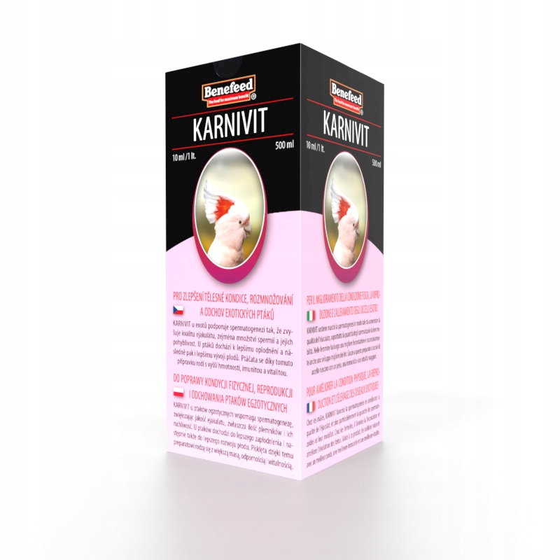 Benefeed Karnivit 500 ml to specjalistyczny, płynny preparat wspierający kondycję fizyczną, rozród oraz prawidłowy odchów młodych ptaków egzotycznych. Produkt marki BENEFEED zawiera L-karnitynę, witaminy oraz substancje pochodzenia naturalnego, które korzystnie wpływają na metabolizm energetyczny, rozwój mięśni oraz funkcje rozrodcze.